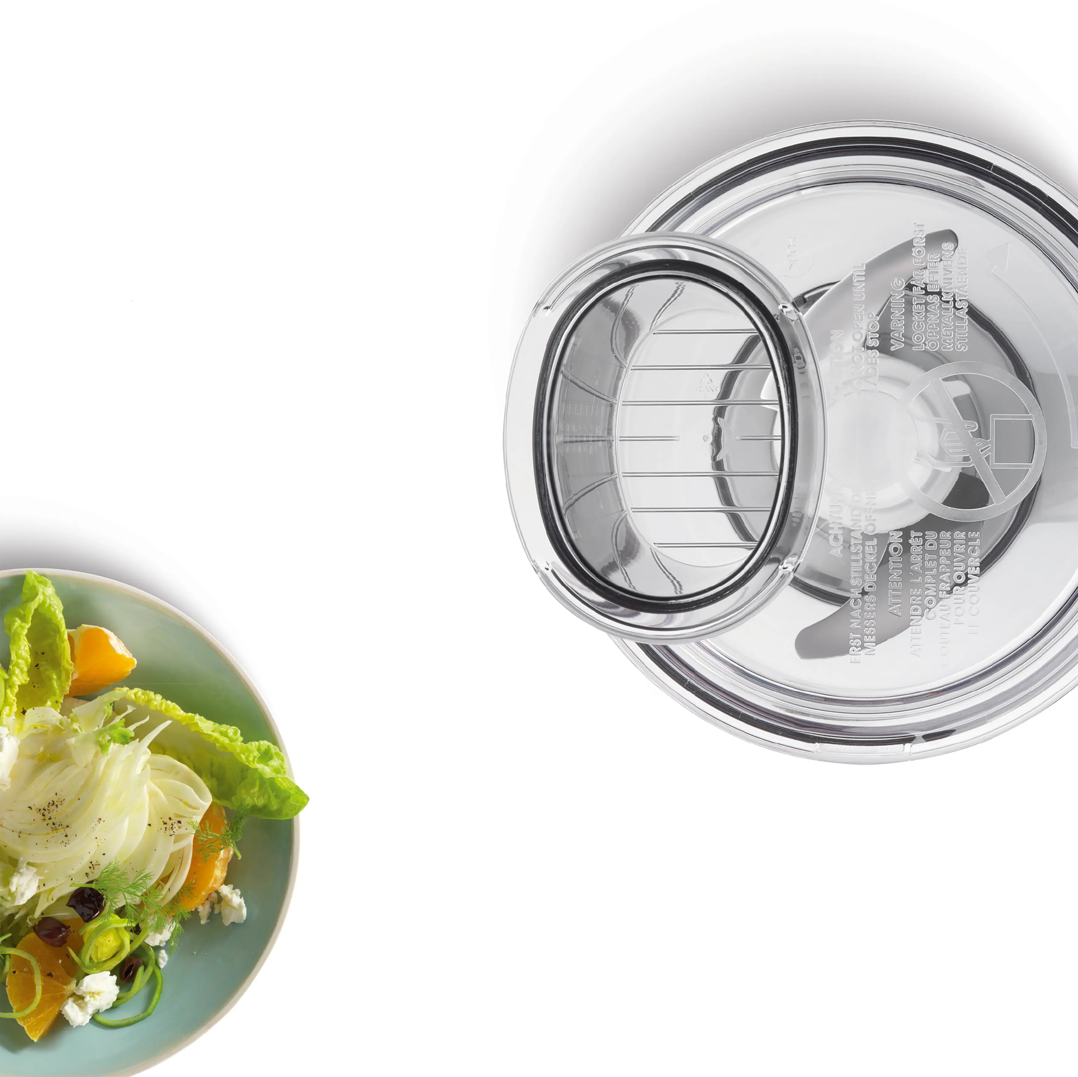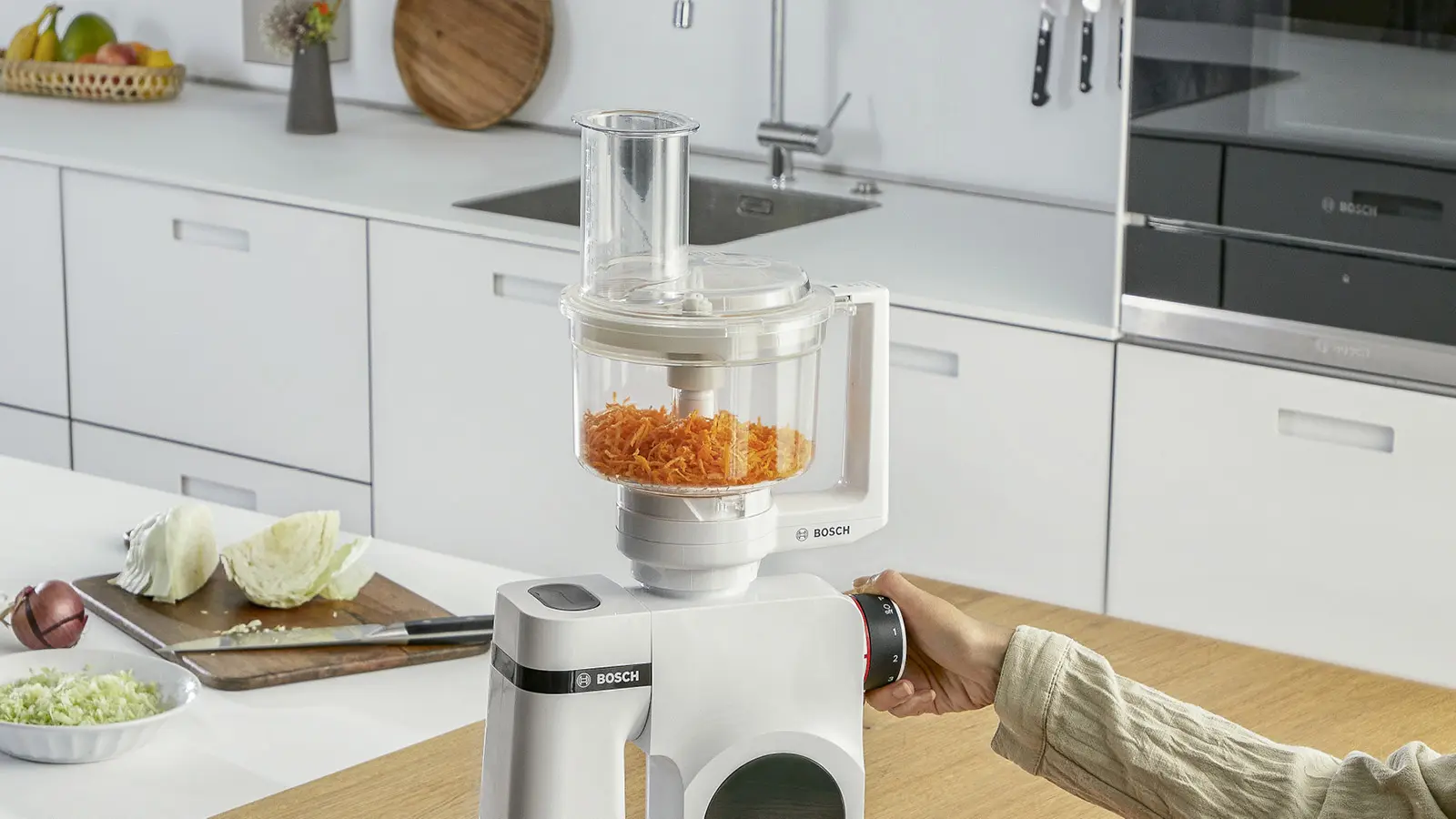 Wyposażenie: nóż uniwersalny + 3 tarcze (5 funkcji), tarcza dwustronna do krojenia na plasterki (grubo i drobno), tarcza dwustronna tnąca na wiórki (grubo i drobno), tarcza do drobnego tarcia