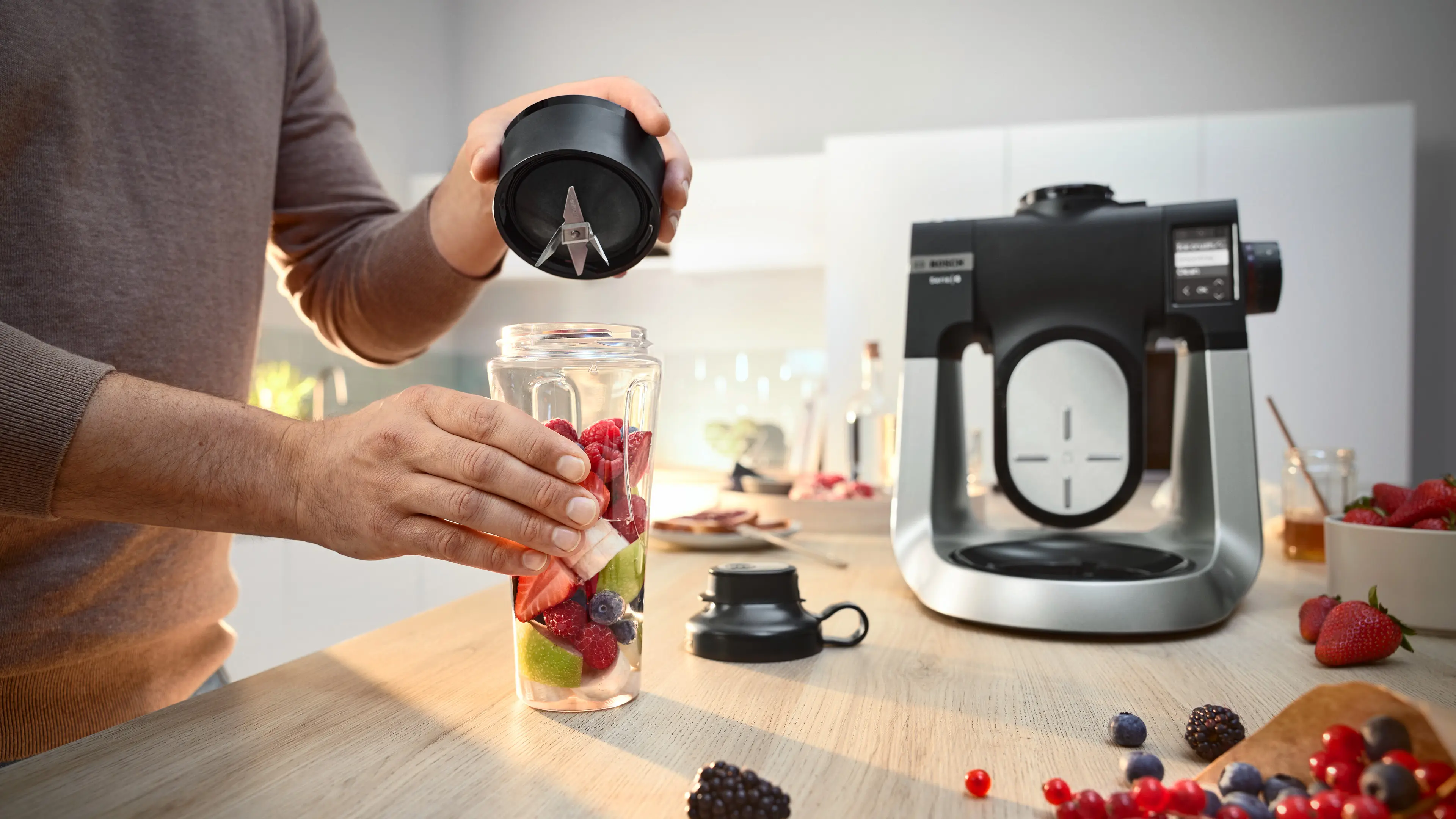 Bezpośrednie blendowanie w butelce ToGo. Ergonomiczny kształt ułatwiający przenoszenie. Szczelna pokrywa zabezpieczająca przed przypadkowym rozlaniem zawartości.