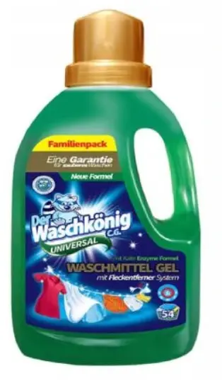 Oryginalny, niemiecki żel do prania DER WASCHKONIG C.G. Universal. Dzięki swojej gęstości oraz skoncentrowanej formule, opakowanie 1,625 g wystarcza nawet na 54 prania.
